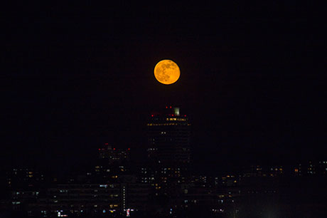 12月6日、日の入りは16:44、月の出はその1時間後の17:47。この日は満月の翌日、十六夜。ビルの間から昇りはじめた月は、夕日の残照で朱色に染まっていた。月は右斜め上に昇りながら、18:14、草津駅前にあるエストピアホテルの真上に移動してきた。前日の満月も撮りたかったのだが、月の出の時刻、この方向は厚い雲に覆われていて、撮影することはできなかった。月だけ撮影するならば、月だけの露出を設定すれば良いが、街明かりを同時に写し込むとなると微妙な露出調整が必要になる。ギリギリこんなところがだろうか・・・