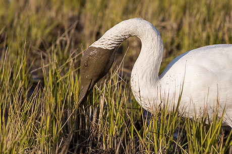 先日、琵琶湖の渇水撮影に行ったついでに、湖北の水田でコハクチョウ撮影。この日は小春日和の陽気で、琵琶湖は青く、静かで穏やかで、渇水風景を撮影するには絶好の撮影日和。この日の水位は−72cmで、奥の洲と湖岸は完全につながっていた。撮影後に道の駅で昼食、コハクチョウを探しながら農道を南下。「あ!いたいた」100羽ほどが水田で採餌中。泥水に顔を突っ込んで、ビチャビチャ音を立てながらイネの根を食べている。どのコハクチョウも顔が泥だらけ。顔を上げた瞬間、目を保護するため瞬膜も泥だらけ。それで見えているの?
