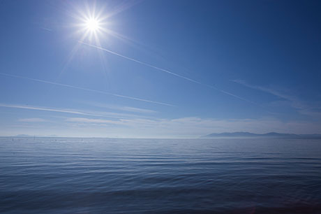 琵琶湖の湖北、穏やかな小春日和、静かな湖面が冬の日にキラキラ輝いていて、白い飛行機雲がまっすぐ湖西方面へ伸びていきます。飛行機雲が出はじめたということは、天気が下り坂なのかもしれません。この写真は、普段は琵琶湖に浮かぶ小島、奥の洲から撮影しています。この日の琵琶湖の水位は−72cm、湖岸から奥の洲まで歩いて渡れるくらい水が引いていました。今年もあとわずかです。来年が今日の琵琶湖のように、穏やかで静かな1年になると良いですね。今年、写真をご覧いただいた皆さま、どうぞ良い年をお迎えください。 飯村茂樹