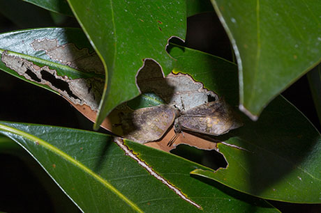 マテバシイの葉上で集団越冬するムラサキツバメ、多いときは1枚の葉上に15匹以上いることもあれば、10匹前後、5匹前後と、越冬する木によってさまざまである。それも一定しているわけではなく、暖かい日に外へ飛び立つ個体もいて、その葉にいる数が常に変化する。葉に当たる日光の角度が影響するのか、ある日全く姿を消してしまうこともある。出会った2匹の個体は、おそらくオスとメスではないかと推測していて、斑紋の濃い右がオスだと判断している。顔と顔を寄せ合い、横向き寝で越冬する微笑ましい姿をワンショット。