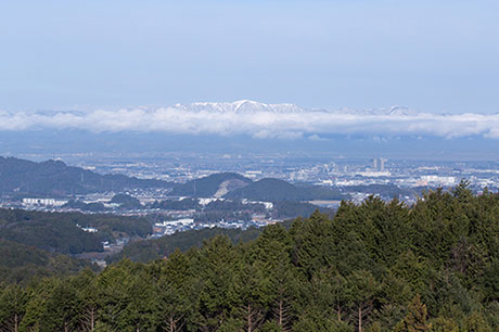 僕の撮影フィールドのひとつ、栗東市の金勝山はここ最近、あちこちでスギ、ヒノキの伐採が進み、今まで木々に隠れていた風景を、新しく見渡せる場所ができている。冬越し撮影途中に通りかかった林道から、たなびく雲の上に雪の比良山が頭を出している風景が目に留まり、ワンショット。霞んではいるが、雲の下が琵琶湖、画面手前が栗東市、奥に草津市、右に見える高層のビルが守山市あたり、それより右が野洲市、うっすらと琵琶湖大橋が見えていて、それを渡ると大津市、ざっとそんな眺めになる。さてと、冬越し林道に向かいましょ・・