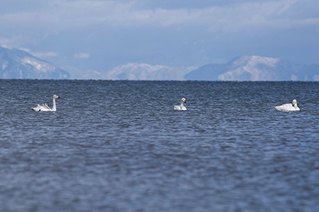 先日、彦根から北には大雪警報が発令されて、滋賀南部にも雪雲が流れ込み、比良山山系も雪の装いになった。その翌日、空は青く晴れ渡り、琵琶湖の湖面も空を映し、真っ青な水面を見せていた。そんな琵琶湖の風景を撮影している中で、沖にコハクチョウ親子の姿があった。青い湖面に真っ白な体が映えていて、逆立ちしながら、盛んに水草を食べているようだった。湖岸の水際に座り込み、ようすを見ていると、背景に湖北の雪山が入り込む位置に移動してくれた。綺麗な湖面にコハクチョウだけがいる風景を、ローアングルでワンショット。