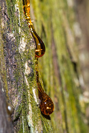 もう何年も前から、1本のスギの木は泣いたまま。幹の触れながら、なぜ泣いているのか尋ねてみても、答えは返ってこない。かなりの大木で、見上げると、はるか上の方からも涙は流れ、地面近くの幹からも涙を流している。その涙は赤色だったり、黄色だったり、太陽の光を透かして見ると宝石のように輝いて見える。かなり粘着力がありポタポタと落ちてくるわけではなく、涙の雫をつなげたように落ちてくる。季節に関係なく1年を通して泣き続けているこのスギは、いったいどうなるのだろう。見た目には健康そうに見えるのだが・・・