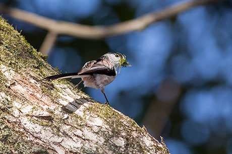 「チュルチュルジュルジュル」二羽のエナガが鳴き合いながらやって来た。一羽がクスノキの枝に止まると、枝に付いたコケをむしり取るように採集しはじめた。もう一羽は、アラカシの葉に付着した昆虫の繭のようなものから、糸を引っ張り出している。早くも巣作りを開始しているらしい。エナガの習性からすると、一度巣材に都合の良いものを見つけると、何度もそこを訪れることが分かっている。先ほど、コケを集めていたクスノキの下でしばらく待ってみることに。「チュルチュルジュルジュル」・・来た来た!予想通りのワンショット。