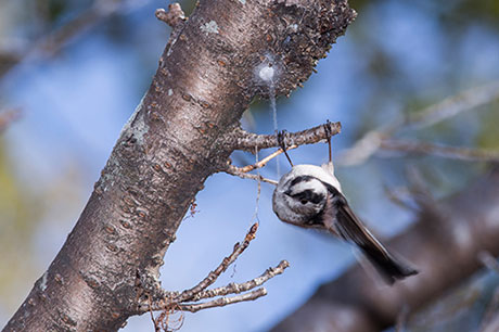 2026/2/23 卵が剥き出し … ジョロウグモの糸を集めるエナガ(草津市)